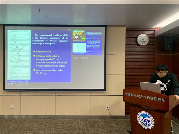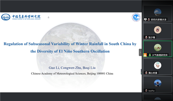 首先由气科院的郭莉博士作了题为《Regulation of subseasonal variability of winter rainfall in South China by the diversity of El Nino Southern Oscillation》的报告,报告中介绍了ENSO通过低层的西太反气旋和高层的walker环流,对华南冬季降水的影响。报告娓娓道来,在厘清研究思路的同时也给大家分享了学习心得,以自己的亲身经历告诉大家要在科研上有恒心有毅力。接着由大气所的邹倩硕士报告《Is the North Pacific Victoria mode a predictor of winter rainfall over South China?》,她十分生动形象的给大家讲解了遥远的维多利亚模态是如何通过ENSO影响华南降水的,同时指出这个发现可以为未来的华南冬季降水的预测提供良好的指示意义。除了专业领域的知识外邹倩也介绍了自己的投稿经历和学习经历,告诉大家要多读文献,积极与导师交流,及时整理科研成果。最后由卢德玉硕士报告《Upper and Lower Bounds on the Predictability of the Tropical Intraseasonal Oscillation》,他从方程的角度给大家介绍了目前热带季节内振荡的可预测性的边界问题,并与线上的同学进行了友好的交流讨论。