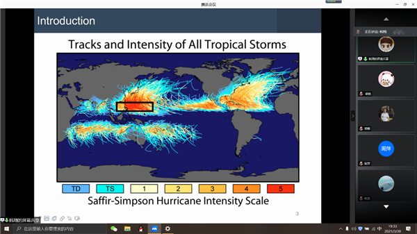 首先由韩翔作了题为《Modulation of boreal extended summer tropical cyclogenesis over the northwest Pacific by the quasi-biweekly oscillation under different El Ni?o-southern oscillation phases》的报告。他在报告中系统地讲解了准双周震荡在不同的ENSO阶段对西北太平洋热带气旋的调节作用,其研究表明准双周震荡的影响主要与大尺度环境因子以及能量的变化有关。接着由大气所的赵寅博士作了题为《青藏高原降水再循环率的年际变率》的学术报告。降水再循环率反映了局地蒸发对降水的贡献,同时也反映了陆气相互作用的强度。赵寅系统地讲解了青藏高原夏季降水再循环率的气候态分布、青藏高原夏季降水年际变率主模态相关的降水再循环率的变化及其背后的物理机制。在报告的最后,她还和大家分享了自己的科研经验,如何系统有效地做文献管理以及如何及时地获取自己研究领域最前沿的科研动态。