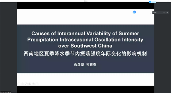 聂彦博的研究方向是极端天气气候,本次他做了题为“西南地区夏季降水季节内振荡强度年际变化的影响机制”的学术报告。他在研究背景中介绍到,西南地区夏季降水的变化受到热带和中高纬多时间尺度因子的调控,影响机制十分复杂,而季节内振荡对该地区的夏季降水有重要贡献,其强弱可以影响降水的强度和持续性。在结合台站降水资料和再分析数据集等,运用功率谱小波分析、合成分析以及水汽和涡度方程诊断等方法进行深入探究后,他的研究发现,西南夏季降水在季内尺度上存在7–20天振荡,振荡强度(SPOI)呈现南北相反的空间分布,且具有明显的年际变化。对海温和大气环流背景场的进一步研究表明,暖海温异常可以通过激发局地Hadley环流异常和西北太平洋反气旋异常为SPOI提供有利的动力和水汽条件,而北大西洋海温三极子则可以通过影响7–20天尺度的瞬变波活动和东亚副热带急流来调控西南地区的夏季降水变率。报告结束后,同学们对报告中感兴趣和不理解的地方进行了交流和提问,聂彦博也对大家的问题一一解答,研讨氛围热烈,学术气息浓厚。