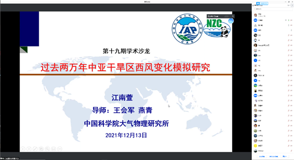 之后江南萱分享了她的研究工作,她的研究方向是古气候模拟,本次报告题目为“过去两万年亚洲干旱区西风变化模拟研究”。她在报告中介绍到,中亚干旱区上空西风南北移动会影响中亚及其下游地区的降水位置和强度变化,研究历史时期亚洲干旱区西风的变化规律有利于加深西风对轨道参数、温室气体浓度、淡水强迫和冰盖等外强迫变化响应的理解。基于TraCE-21ka模拟试验对亚洲干旱区中纬度西风在过去两万年的南北移动变化进行研究,结果表明,主导亚洲干旱区西风变化的外强迫在不同季节和时间段具有差异性;此外,亚洲干旱区西风变化与经向温度梯度的变化相联系,同时受到北大西洋与北印度洋的共同调控。报告结束后,在交流讨论环节里,同学们对报告中所介绍的模式实验设计和数据处理方法等问题展开了热烈讨论,江南萱也对提出的问题作出详细解答。至此,此次学术沙龙活动完美落幕。