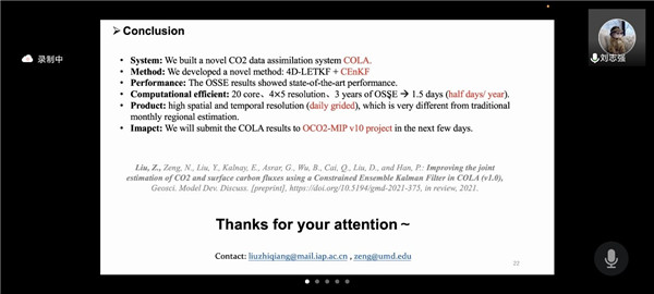 之后刘志强分享了他的研究工作,他的研究方向是资料同化、碳循环,本次报告题目为“基于有限制集合卡尔曼滤波CEnKF的CO2资料同化系COLA的构建及应用”。他在报告中介绍到,目前大气中二氧化碳(CO2)的反演测量,主要的研究方法有四维变分(4D-Var)、集合卡尔曼滤波(EnKF)和贝叶斯合成方法。报告人采用约束集合卡尔曼滤波(Constrained Ensemble Kalman Filter, CEnKF)方法来保证全球CO2质量的守恒,使用额外的同化来调整每个模型格点的CO2,并确保分析与全球CO2质量的首次猜测之间的一致性。CEnKF不仅降低了全球SCF的年偏差,而且显著降低了全球大部分大陆地区的偏差。报告结束后,同学们对报告中感兴趣和不理解的地方进行了交流和提问,刘志强也对大家的问题一一解答,研讨氛围热烈,学术气息浓厚。