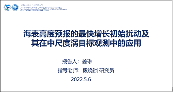 接下来姜琳分享了自己的研究工作,她的研究方向是海洋中尺度涡的目标观测、可预报性及资料同化,本次报告介绍了海表高度预报的最快增长初始扰动及其在中尺度涡目标观测中的应用研究。她在基于条件非线性最优扰动方法的基础上,揭示了中尺度涡的目标观测敏感区及不稳定扰动的空间特征,用正压不稳定性理论阐明了该敏感区及不稳定扰动空间特征的机制,并通过观测系统模拟试验验证了该机制,提出了中尺度涡的最优观测阵列方案,在一定程度上提高了海表高度异常的预报技巧。报告结束后,姜琳与线上的同学们进行互动,解答了同学们的疑问。