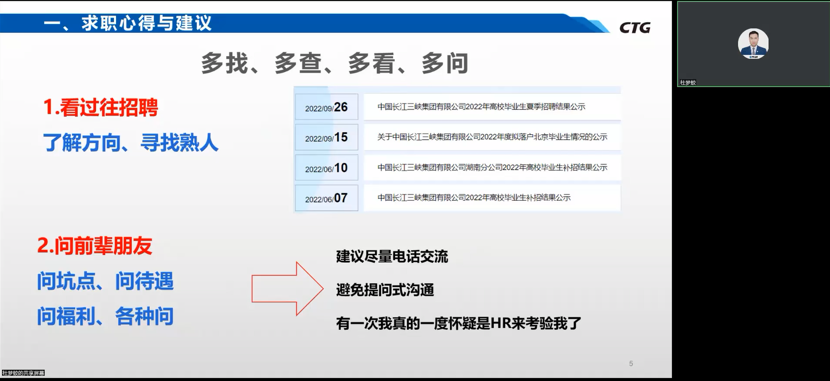 第二位分享人是2020届博士毕业生杜梦蛟。杜梦蛟就职于三峡集团科学技术研究院,他分享了求职心得与建议,并介绍了三峡集团的业务与企业文化。详细分析了入职后的机遇与挑战,对师弟师妹们寄予殷切期盼。