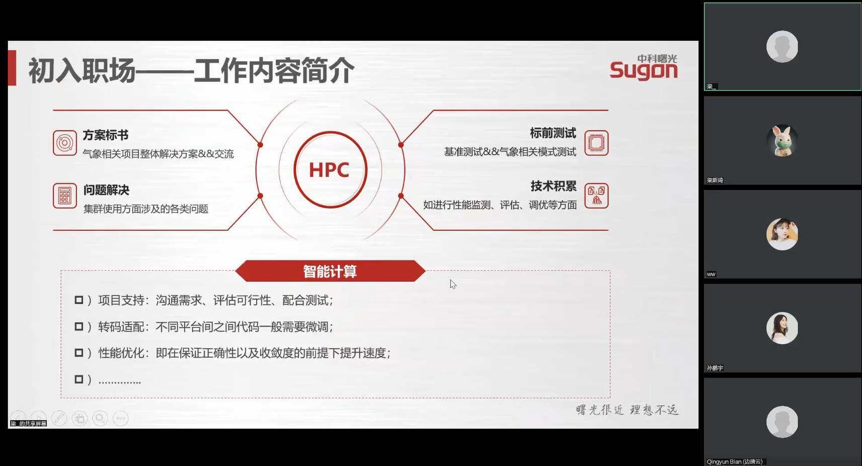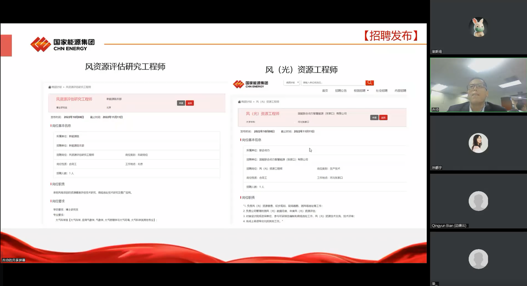 第六期的四位嘉宾分别是就职于国家能源集团龙源电力集团股份有限公司的2018届博士毕业生乔帅、曙光信息产业(北京) 有限公司的2020届博士毕业生梁晶晶、浪潮电子信息产业有限公司的2020届博士毕业生边晴云、北京墨迹风云科技股份有限公司的2021届硕士毕业生唐婕。四位校友介绍完用人单位基本情况和企业文化后,乔帅给大家介绍了单位笔试面试的基本要求,面试的注意事项和准备并欢迎有意进一步了解的师弟师妹可以会后进一步跟他交流。