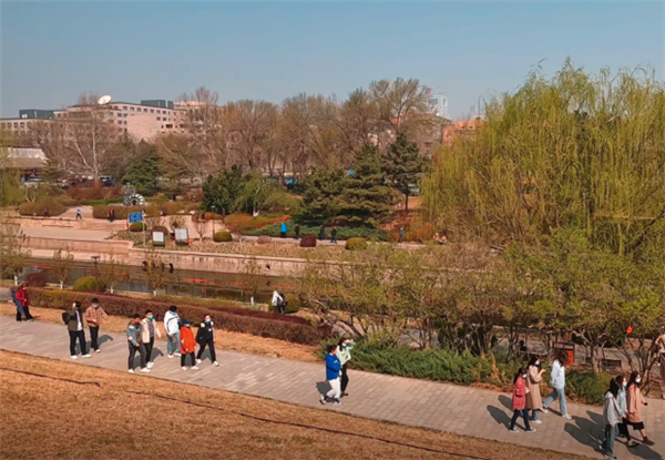 同学们在午餐过后,陆续抵达活动地点,完成签到后,在公园入口瀑布旁的台阶处进行了合照留念,之后成群结伴地向公园另一侧的尽头走去。空中飘散着淡淡的清香,花朵在微风中轻轻摆动,一簇簇鲜艳的海棠花和梅花在小月河的映衬下显得更加美丽动人,同学们纷纷停下脚步拿出手机记录着美好的春景。河岸两边行人如织,有小朋友拿着画笔在写生,亦有活力四射的老年人一展歌喉,更不乏爱跑步的年轻人在阳光下恣意挥洒着滚烫的汗水。而我们健步走的队伍也成为了这春日里亮丽的一道风景线,青春和欢快的气息弥漫在空气中。