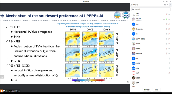 马娇首先向大家介绍了大范围持续性降水的移动性特征。通过位涡倾向方程诊断持续性强降水南移的内动力过程,指出了非绝热加热影响涡度变化对降水南移的重要性。最后,通过WRF模拟2003年的一次强降水事件来验证了结论。