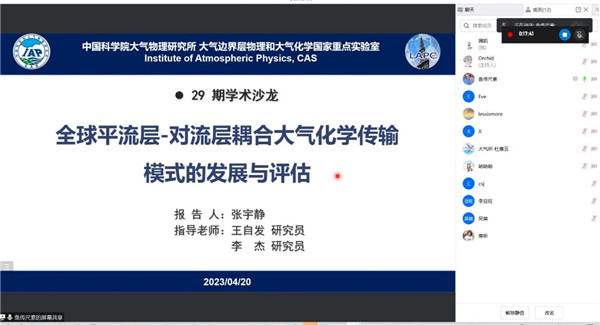 第二位做报告的张宇静首先介绍了全球大气化学传输模式GNAQPMS的基本情况,指出GNAQPMS对平流层化学模拟能力的不足。她对GNAQPM的模块进行了更新,并将其发展成为对流层-平流层一体化的全球大气化学传输模式GNAQPMS-Stra,接着对平流层关键大气化学的空间分布和时间演变特征进行了模式评估,结果表明GNAQPMS-Stra能很好地再现观测数据特征。最后,张宇静分享了自己在求职过程中的经验,给师弟师妹们提供了很多就业建议。