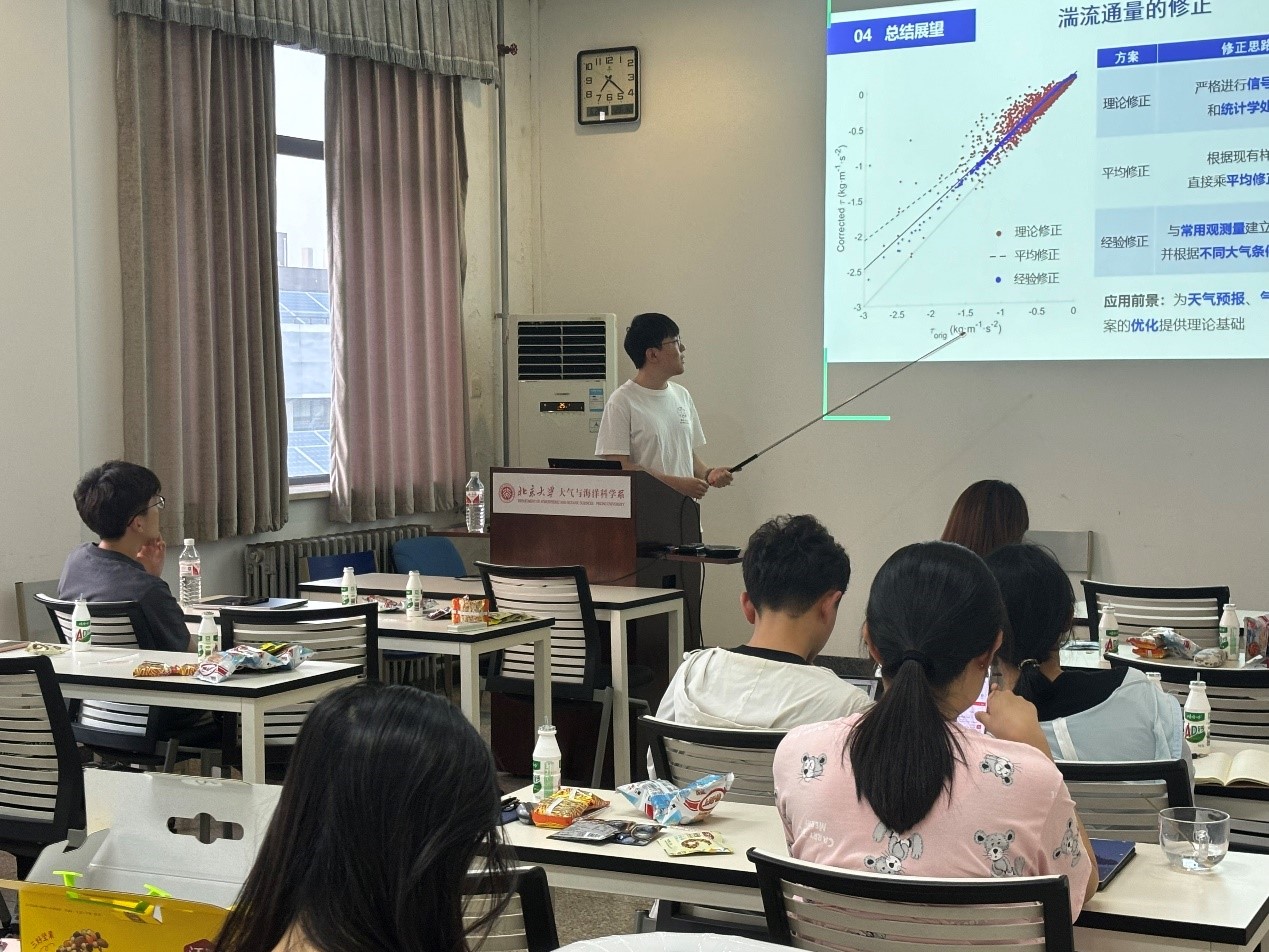 首先,刘子涵带来题目为《非湍流运动提取及其对准确获取湍流通量影响的定量研究》的报告,其工作内容为基于Hilbert-Huang变换定义传输特性并进一步将其用于从观测数据中区分非湍流运动,从而提出一种新的分解方法以重建湍流通量时间序列。报告指出,非湍流运动的存在会导致湍流通量普遍被高估,并且高估的程度随着非湍流运动的复杂性和强度的增加而增大。该工作的创新点在于可以根据上述结论给出经验关系及确定相应系数从而指导实际应用中对湍流通量的订正,例如可以应用于大气湍流的模拟以及气象和气候模式的参数化。