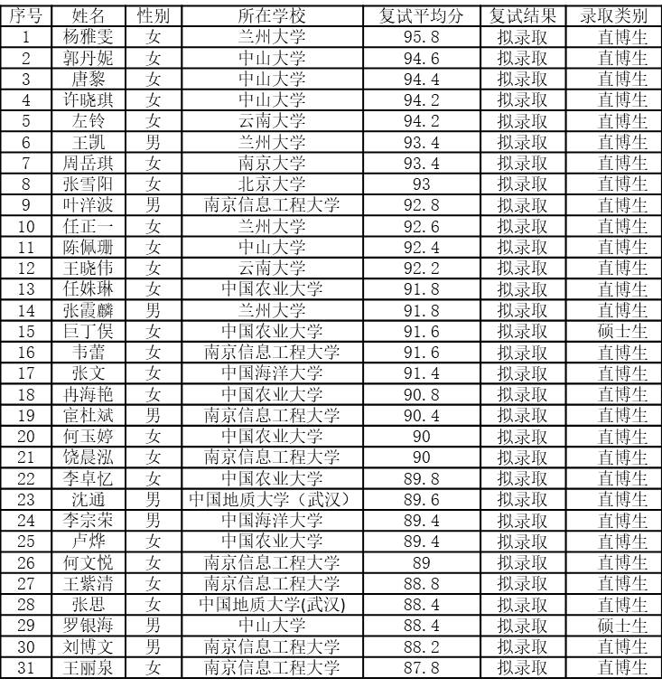 根据教育部、中国科学院大学相关文件精神,本着“公平公正、全面衡量、保证质量、宁缺毋滥”的原则,通过对考生面试、政审以及体检等综合考核,经大气所教育委员会审核批准,杨雅雯等29名同学根据本人申请并通过考核,被拟录取为大气科学学科免试推荐直博生、巨丁俣等2名同学被拟录取为大气科学学科免试推荐硕士研究生。请拟录取考生于10月7日前登录教育部“推免服务系统”报名并在拟录取后确认,不按时登录推免系统报名者,大气所不再为其保留名额。