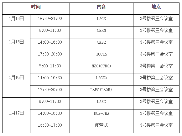 为了更好地做好招生宣传,吸引优秀生源,提高生源质量,我所与南京信息工程大学签定了五年(2019年-2023年)的冬令营实践活动计划。2020年冬令营时间定于1月13-18日开展,南京信息工程大学长望学院42名本科生将来所进行为期一周的冬令营活动,届时冬令营营员将到每个研究室活动半天,现将各研究室接待时间通知如下,请各研究室和各位老师安排好冬令营营员活动。研究生部也暂时为各研究室预定了3号楼第三会议室,如果您选用其它会议室,请提前告之,便于我们准时把营员送到。