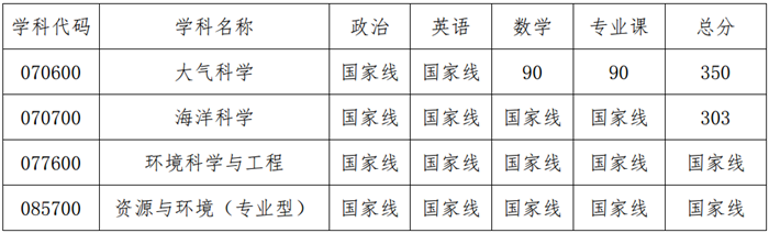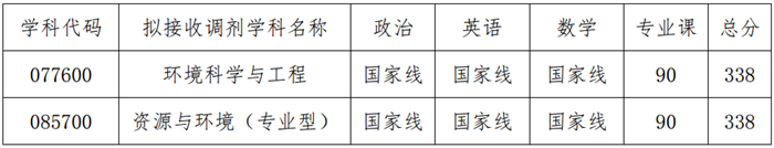 我所环境科学与工程(077600)、资源与环境(085700)学科因初试合格考生人数低于实际拟招生人数,故第一志愿报考我所且初试成绩达到以下合格分数线的考生,待复试开始后可以申请调剂。
