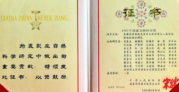 照片1.获得1987年度国家自然科学一等奖证书