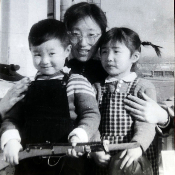 照片6.当时的天气室主任李玉兰与两个小孩在一起