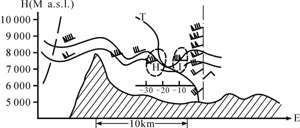 从实践到认识:科学观测研究分析高空风巨变原因 1980年春,我组在珠峰大本营观测研究背风波动,认识了高空风巨变的原因。如图2,原来,在珠峰背风波的下沉气流区域存在中小尺度高压,与大风伴随,不宜攀登;在背风波的上升气流区域存在中小尺度低压,伴随小风,宜于攀登。