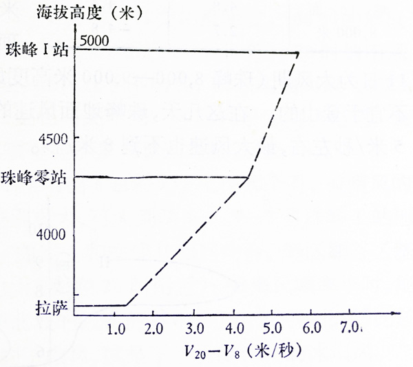1966年下半年,我在上述统计分析结果的基础上,进一步发现,尤其在宜于攀登珠峰的好天气时段,这种现象更为显著。即,在宜于攀登珠峰的好天气时段中,每升高1000米带来的风速日较差可增加3~4米/秒。由此推论,在海拔高度8000米附近,地面风速日较差可达15~18米/秒。