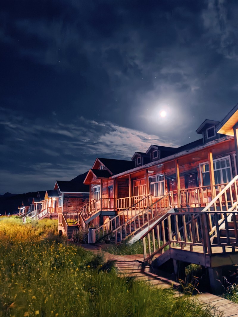 云漫木屋月胧明,摄于张掖山丹军马场。云淡如烟,风轻似梦,月光似一盏明灯照亮夜晚。木质小屋散发着温馨的气息,这份难得的宁静与惬意让人心之神往。(陶益凡提供)