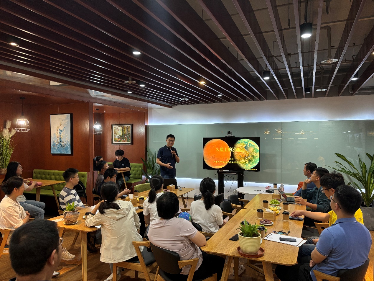 2024年9月23日中午,在中国科学院大气物理研究所3号楼咖啡厅,成功举行了震潮沙龙第四期学术交流活动——“火星气象密码:解锁红色星球的水与沙”。本期活动邀请了大气所的董理研究员和地质地球所的吴兆朋副研究员作为主讲嘉宾,大气所李艺苑副研究员主持。活动吸引了20多位老师和研究生参加。
