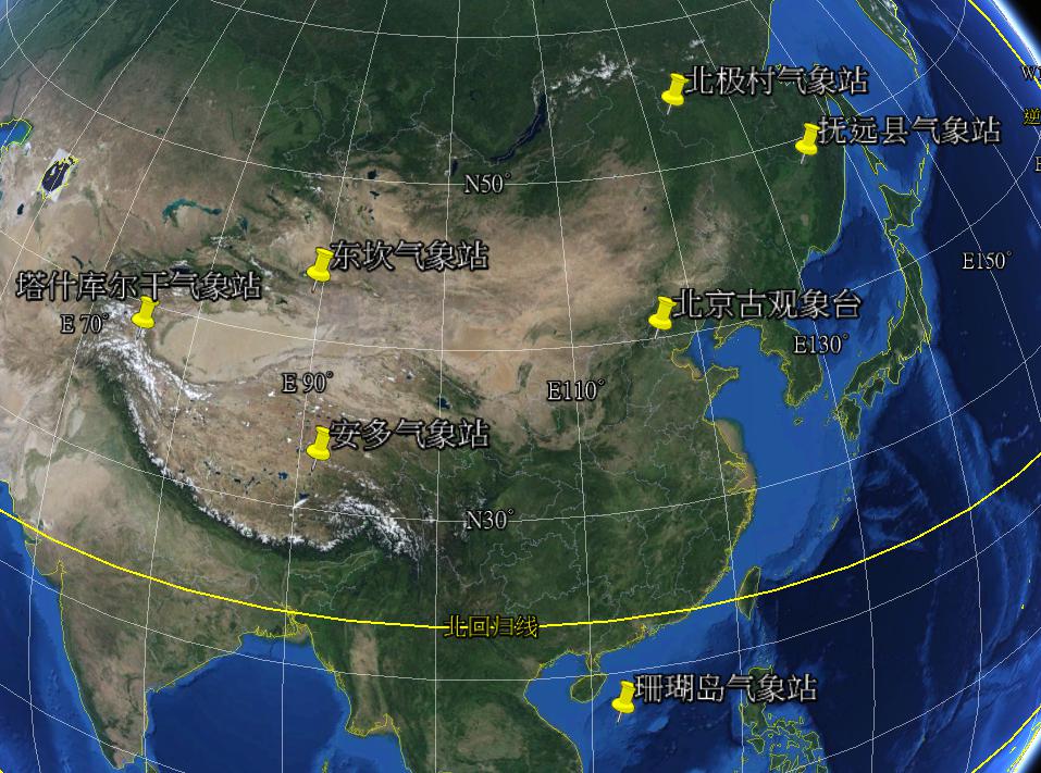 东坎气象站(42°50′N,89°15′E),位于新疆吐鲁番盆地深处,海拔高度-48.7米,年平均气压为1023.3百帕。该站所处地区属于温带气候区,但远处内陆,受海洋季风影响小,年平均降水量只有14.9毫米,日照时间长,年平均气温为14.5℃,夏天气温高达40℃以上。(笔者在Google Earth上搜寻许久都没有找到东坎气象站的卫星图片)