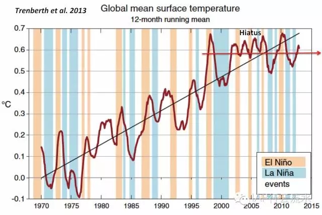 在1998-2012期间,全球地表平均温度升高的速率只有0.05oC/10年,然而1951年以后的平均升高速度为0.12 oC/10年。也就是说1998年(超级厄尔尼诺年)以来,全球变暖减缓了!这个现象被叫做global warming Hiatus。这个概念迅速被反对气候变化的人和组织大做文章,说气候没在变暖,气候变暖是政治阴谋种种,然后迅速被炒热。