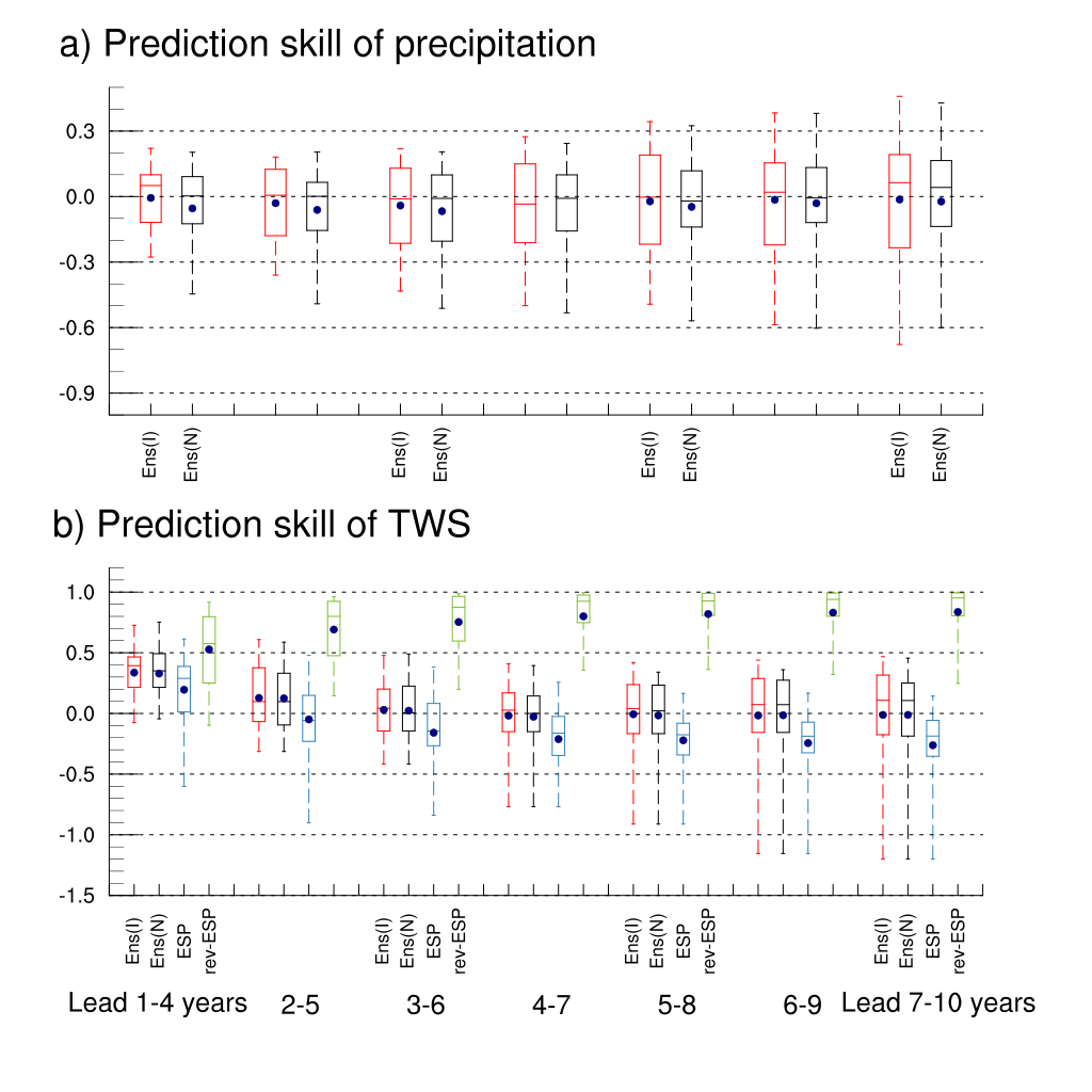图1.全球不同流域降水(a)和陆地水储量(TWS;b)在不同预见期的预测技巧(纳什效率系数NSE,NSE=1表示完美预测,NSE<0表示无预测技巧)。其中,Ens(I)代表初始化气候预测,Ens(N)代表无初始化的气候预测(即仅有外部强迫信息),ESP代表集合径流预测(仅有水文初始信息,无气候预测信息),rev-ESP代表逆集合径流预测(无水文初始信息,但使用真实气候信息)。