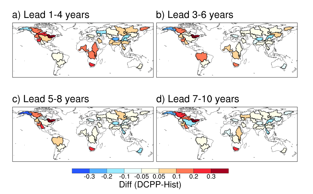 该研究量化了初始化气候预测、气候系统外部强迫和气候内部变率信号等因素对TWS长期预测的影响。结果表明,结合初始化气候预测和外强迫信号可有效改善69%流域的TWS预测技巧,纳什效率系数提高0.14-0.24,在长预见期、高纬度地区尤为明显。结合气候内部变率信号(如:太平洋年代际振荡和大西洋多年代际振荡)则有效改善1-10年预见期下38%-90%流域的TWS预测技巧。