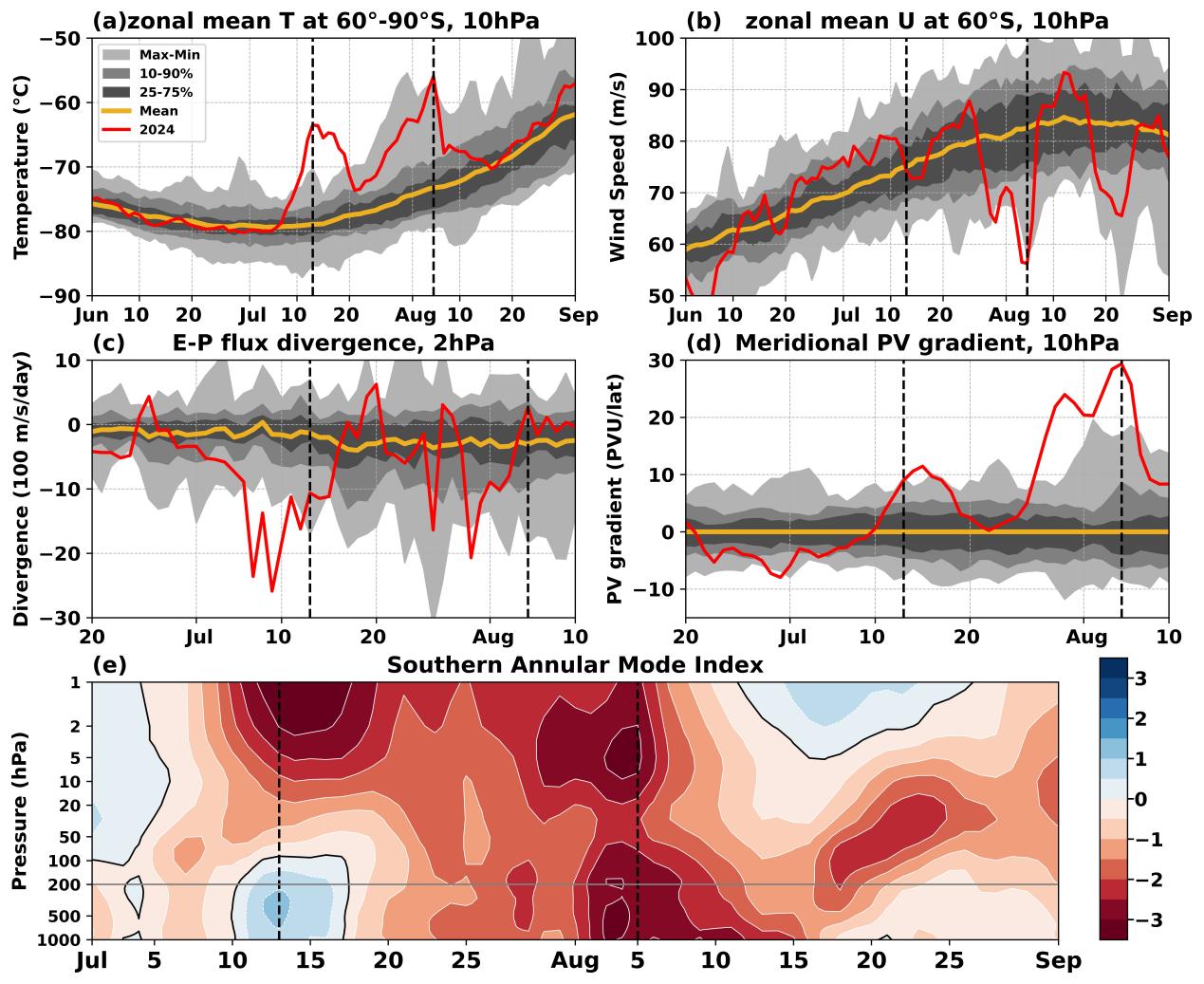 图 1. 各子图时间序列如下:(a)每日 10 hPa MERRA-2 再分析纬向平均温度,平均范围为 60°S–90°S(红线);(b)每日 10 hPa MERRA-2 再分析 60°S 纬向平均纬向风(红线);(c)每日 2 hPa、45°S 处的 E–P 通量散度距平(红线,单位:100 m/s/day);(d)每日 10 hPa、55°S–75°S 平均的纬向涡度势梯度距平(红线),时间范围均为 2024 年 6–8 月。(e)2024 年 7 月至 8 月的每日标准化南半球年环模(SAM)指数。图中所有横坐标的刻度表示每月第一天,虚线表示 2024 年 7 月 13 日和 8 月 5 日。图(a)和(b)中的黄色线为 1981–2020 年的日气候平均值,灰色阴影分别表示 1979–2023 年冬季日值的第 25/75 百分位(深灰)、第 10/90 百分位(次深灰)及最大/最小值(浅灰)。