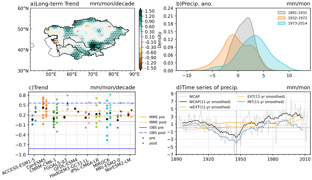 图一 中亚冬季降水的长期变化趋势与成因分析。(a) 1891至2014年中亚冬季降水的长期趋势分布图,打点表示趋势在统计上显著。(b) 不同时期(1891至1931年、1932至1972年、1973至2014年)降水异常的分布差异。(c) 各气候模式对1891至1946年与1947至2014年观测降水趋势的模拟结果。不同符号区分早期与后期,展示内部变率对趋势的影响。(d) 观测到的降水变化及其内部变率与外强迫成分的分解。
