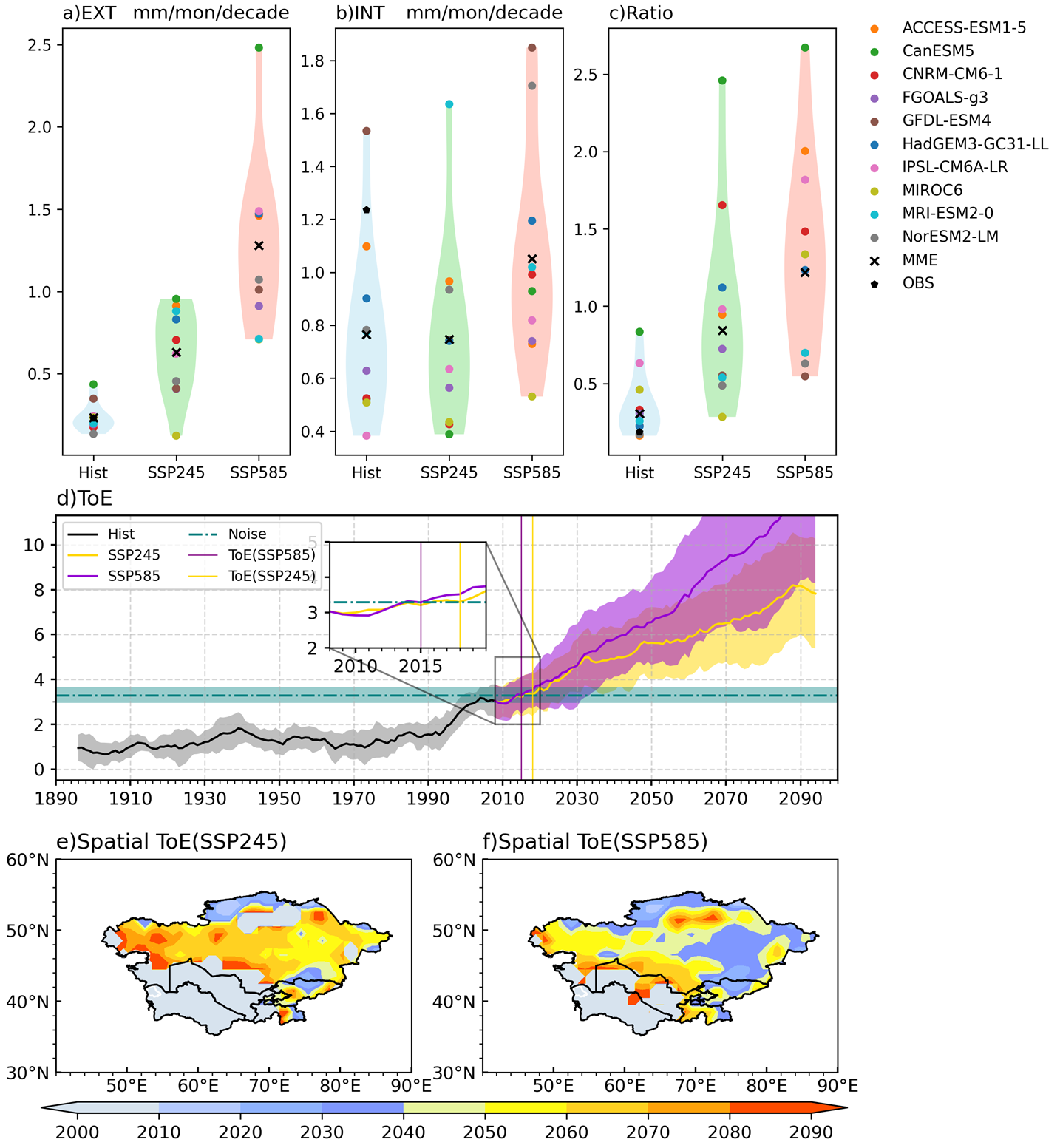 图二 未来不同排放情景下中亚冬季降水外强迫信号的演变与显现时间(ToE)分析。(a) 21年滑动窗口下,各气候模型、多模式集合平均(MME)和观测值在历史(1891–2014年)、中等排放(SSP2–4.5)和高排放(SSP5–8.5)情景(2015–2099年)中的外强迫趋势。(b, c) 同(a),但分别表示趋势的标准差和信噪比(趋势与标准差之比),衡量外部信号是否显著强于内部变率。(d) 外强迫降水异常的11年滑动平均时间序列,分别对应历史(黑色)、SSP2–4.5(黄色)和SSP5–8.5(紫色)情景。阴影表示模式间的不确定性范围。插图显示不同情景下外部信号超过内部噪声(ToE)的时间点,黄色和紫色垂直线分别表示SSP2–4.5和SSP5–8.5情景下的ToE时间。(e) SSP2–4.5情景下中亚地区ToE空间分布。(f) 同(e),但为SSP5–8.5情景结果。