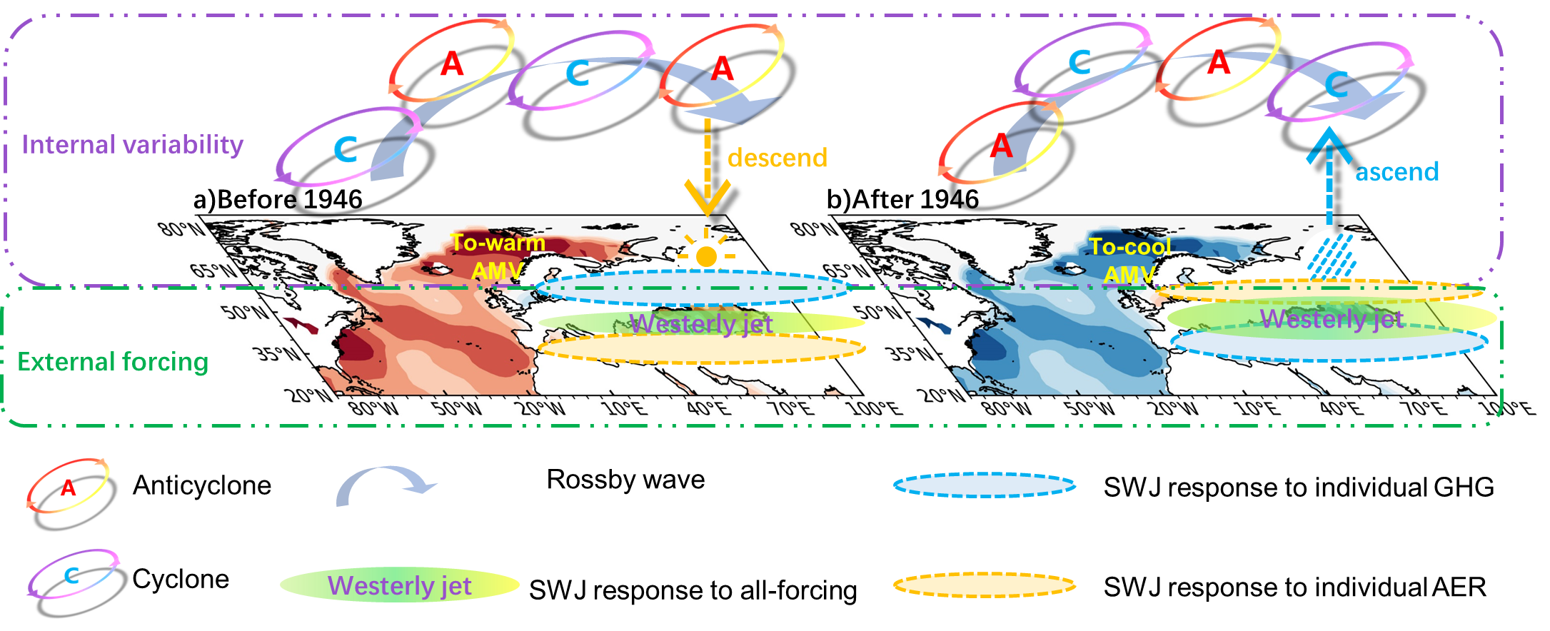 图三 中亚冬季降水在1946年前后变干与变湿的动力机制示意图。(a) 1946年之前,(b) 1946年之后。图中展示了大西洋多年代际变率(AMV)位相转换、西风急流(SWJ)位置变化、AMV诱发的200 hPa罗斯贝波列,以及中亚降水趋势的变化。红色(蓝色)阴影表示AMV由冷向暖(由暖向冷)转变,蓝色曲线表示罗斯贝波传播路径。字母A与C分别代表反气旋与气旋异常。绿色、蓝色虚线和黄色虚线椭圆分别表示SWJ对全强迫、温室气体(GHG)和气溶胶(AER)强迫的响应。图中黄色太阳符号和向下箭头表示中亚地区变干和异常下沉运动,蓝色雨滴符号和向上箭头表示变湿和异常上升运动。