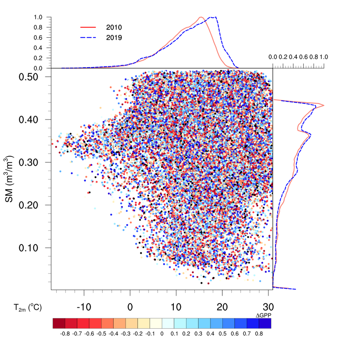 图2. 低纬高原生态系统在不同水热状态下的响应差异。图中红色点代表2010年干旱事件,显示在土壤水分亏缺下生态系统生产力(GPP)大幅下降;蓝色点代表2019年热浪事件,显示在充足前期“水文记忆”支撑下,生态系统对高温表现出显著韧性甚至正增长。