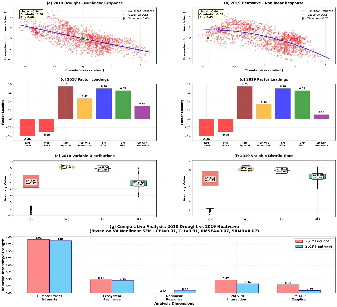 图3. 结构方程模型(SEM)揭示的机制转换。量化分析表明,2010年生态系统完全受“水文效应”主导(水分限制),而2019年则转变为由“热效应”主导(能量驱动),前期土壤湿度是触发这一机制转换的关键开关。