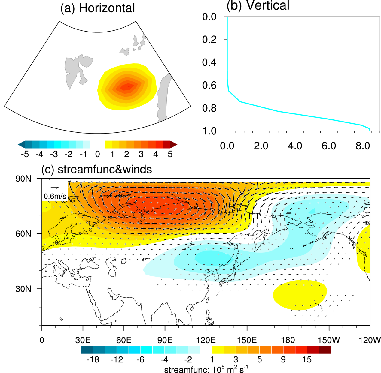 图5. LBM数值试验中北极浅层增引发的大气环流响应。LBM数值试验中设定的热源的 (a) 水平分布和 (b) 垂直结构。(c) LBM数值试验中200hPa风场与流函数对设定热源的响应。