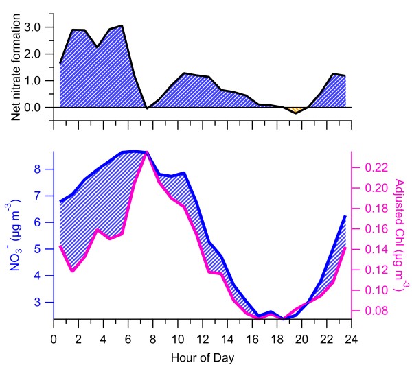 图1. 以氯化物作为硝酸盐气-粒分配过程的参考定量白天和夜间硝酸盐生成量