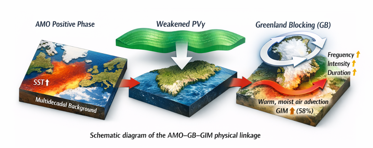 本研究系统分析了1950-2022年格陵兰冰盖夏季融化量的变化趋势,通过线性分解方法,将夏季格陵兰冰盖融化趋势分解为人类排放温室气体导致的长期增暖趋势和大西洋多年代际振荡(AMO)相关的自然变率两部分,警示了可能被低估的格陵兰冰盖在持续变暖背景下的脆弱性。结果表明,格陵兰冰盖的融化并非线性增长,而是呈现出明显的阶段性特征。1972年左右,AMO和格陵兰冰盖融化量均达到最低值,而1994年后,AMO转为正位相,格陵兰冰盖融化也快速增强。1994-2022年期间,AMO对格陵兰冰盖夏季融化加速的贡献约为58%,而全球变暖的贡献约为42%。这一时期内,格陵兰岛上空的经向位涡梯度(PVy)显著减弱,为格陵兰阻塞的发生和维持创造了有利的动力学环境。AMO导致的格陵兰冰盖融化增强中,约有58%是通过增强格陵兰阻塞这一途径实现的。