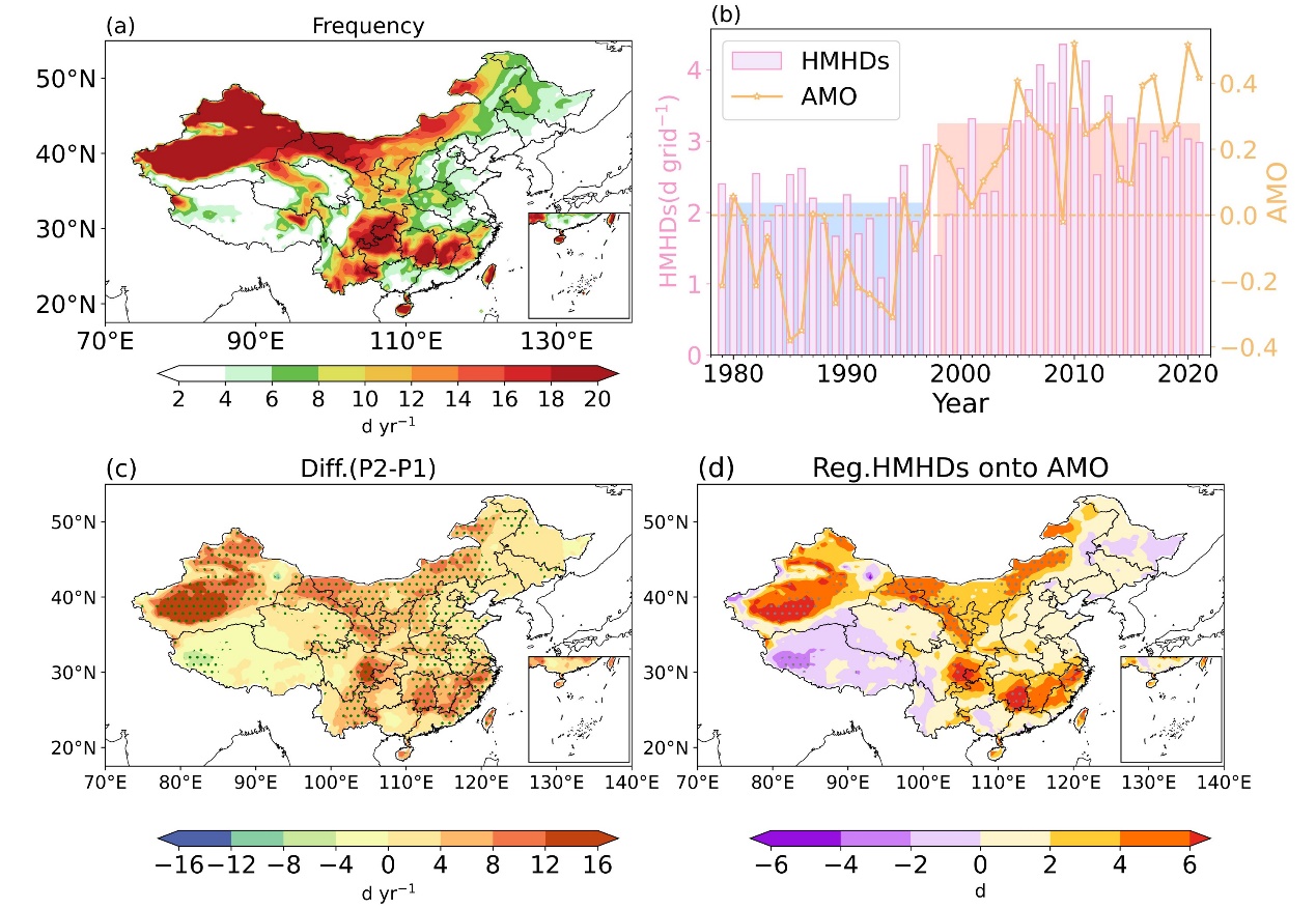 近日,中国科学院大气物理研究所赵亮高工与南京信息工程大学沈新勇教授及清华大学卫健学院黄存瑞教授联合国家气候中心丁一汇院士团队在Atmospheric and Oceanic Science Letters上发表一篇题为“The increase in hot–dry events with a high risk of mortality in China associated with the phase transition of the Atlantic Multidecadal Oscillation”的论文,该研究将气象要素数据和中国278个区县的死亡数据结合,揭示了中国高死亡风险的复合极端干热事件的时空变化特征,探讨了与此类干热事件的年代际变化特征与大西洋多年代际振荡(Atlantic Multidecadal Oscillation,AMO)的关系。