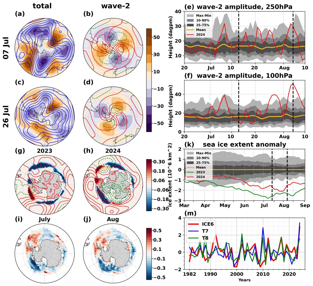 图 2. 各子图时间序列如下:(a, c)250 hPa 位势高度的空间分布(等高线,单位:dagpm)及其距平(填色,单位:dagpm);(b, d)250 hPa 位势高度距平的第二波型分量(填色,单位:dagpm)及其气候态(等高线,单位:dagpm),分别对应(a–b)2024 年 7 月 7 日和(c–d)2024 年 7 月 26 日;(e–f)与图 1a 类似,但为从 250 hPa 和 100 hPa 位势高度计算的波2振幅(红线);(g–h)2023 年和 2024 年 6 月的月平均海冰浓度距平(填色,单位:百分比)和海平面气压距平(等高线,单位:Pa);(i–j)1982–2024 年间,南极地区 6 月海冰浓度距平与 7 月和 8 月 10–30 hPa、60°S–90°S 平均温度之间的相关系数分布图,点状区域表示在 95% 置信水平上显著;(k)与图 1a 类似,但为 2023 年 3 月至 8 月(绿线)和 2024 年同期(红线)的每日海冰范围距平;(m)标准化的温度距平指数时间序列,包括 7 月(T7)和 8 月(T8)10–30 hPa、60°S–90°S 平均温度距平,以及罗斯海和阿蒙森海(180°W–90°W)区域平均的海冰浓度距平指数(ICE6,已乘以 –1,表示海冰减少)。