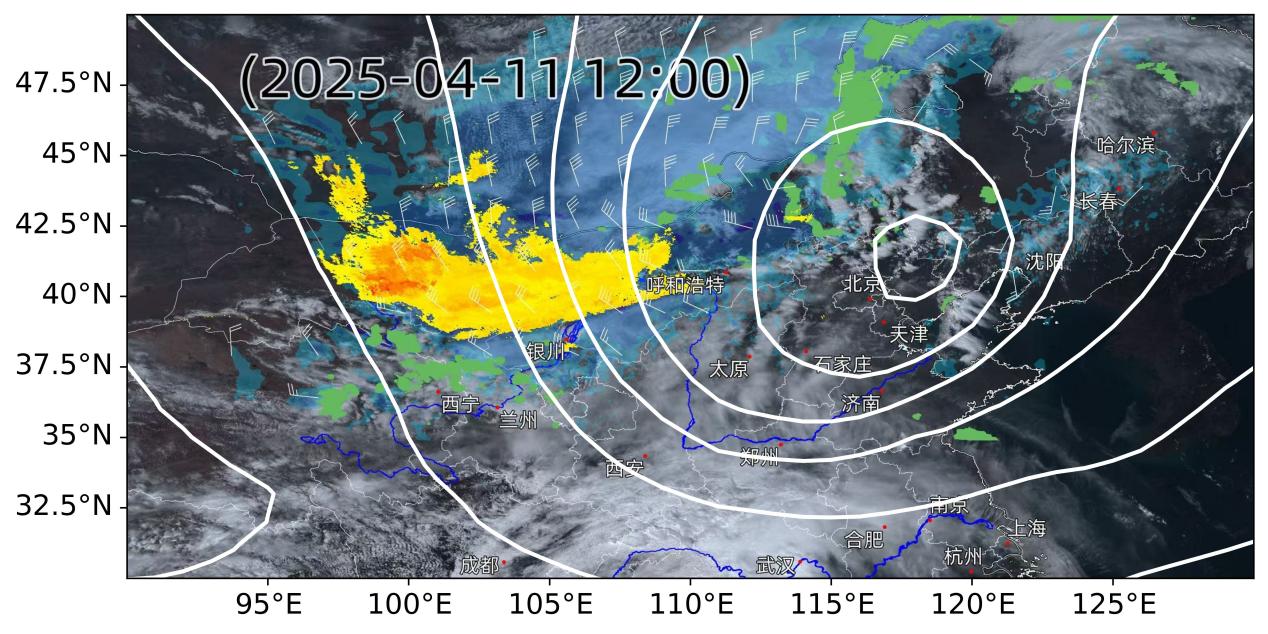 本文通讯作者谢作威指出:“在全球持续变暖背景下,中高纬地区的Rossby波振幅增强,更易形成阻塞型切断环流,这一变化可能放大蒙古国荒漠化对跨境沙尘输送的影响。” 近期4月10日,西西伯利亚和东北亚高压脊的强烈北伸,将西风槽切断形成一个强度可比超强台风的东北冷涡,引发沙尘的跨境输送,在之后三日持续影响我国大部分地区,甚至波及南方。