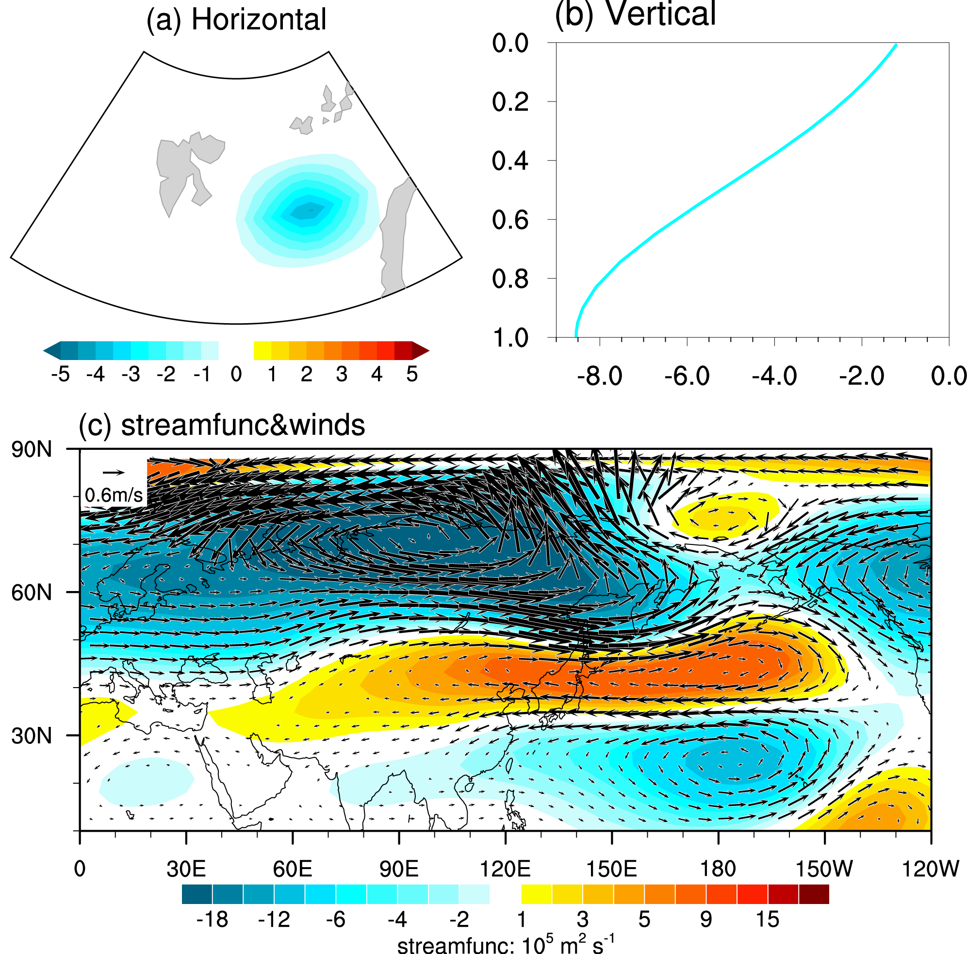 图4. LBM数值试验中北极深层冷引发的大气环流响应。LBM数值试验中设定的冷源的 (a) 水平分布和 (b) 垂直结构。(c) LBM数值试验中200hPa风场与流函数对设定冷源的响应。