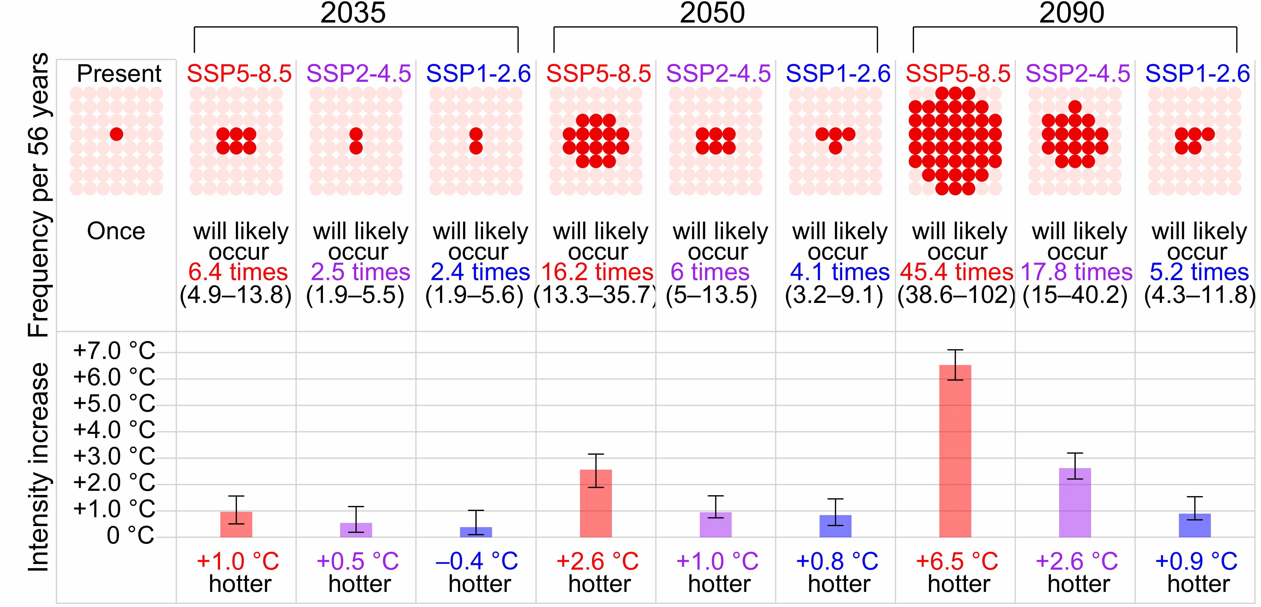 图2.未来不同排放情景下,类似2024年9月初的秋季热浪事件的发生概率(上)和强度(下)变化(相比于2024年气候状态)