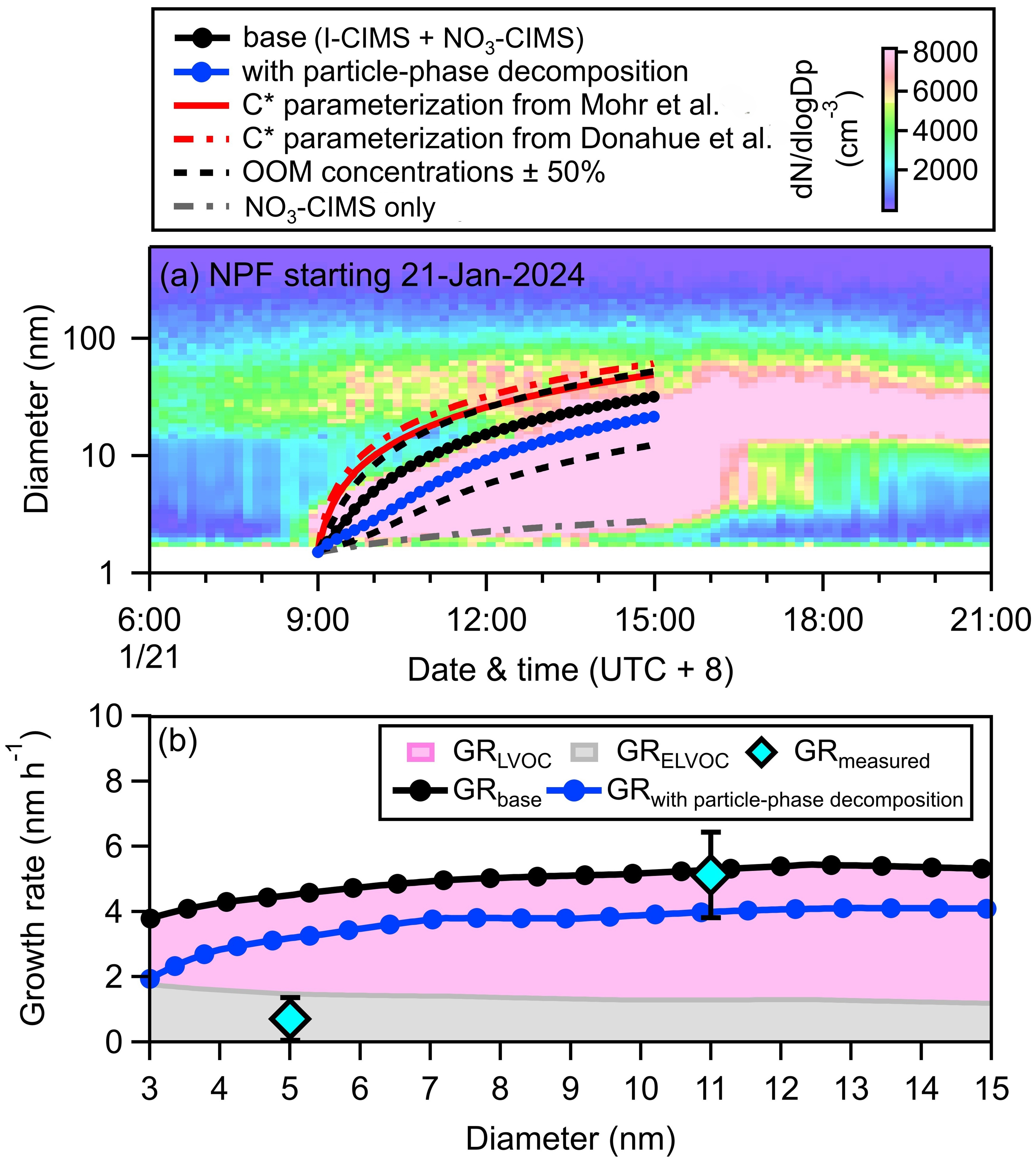 图3. (a)1月21日观测到的一次典型NPF事件。图中虚线与实线分别表示在不同模拟条件下得到的颗粒物粒径变化。(b)LVOCs与ELVOCs对颗粒物GR的贡献,以及模拟GR与实测GR随颗粒物粒径的变化对比。
