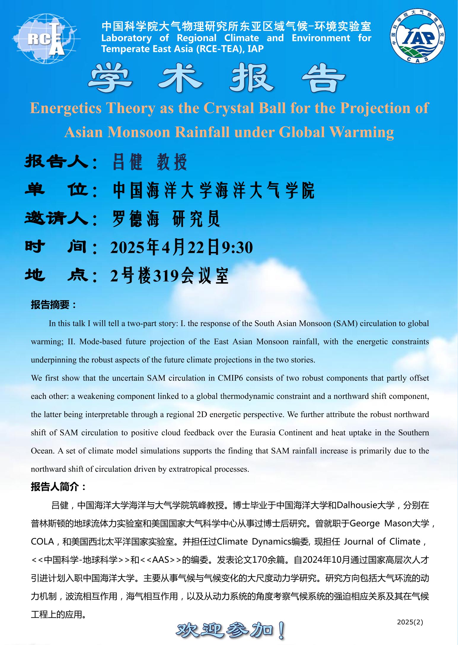 【4.22】Energetics Theory as the Crystal Ball for the Projection of Asian Monsoon Rainfall under Global Warming