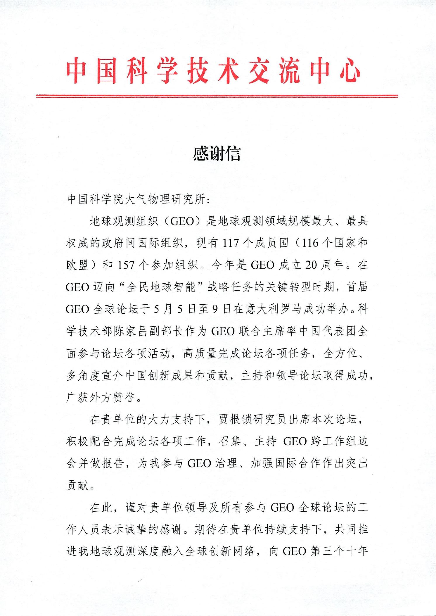 近日,科技部中国科学技术交流中心发来感谢信,感谢我所贾根锁研究员等人在地球观测组织(GEO)全球论坛做出的突出贡献。并期待我所持续支持,共同推进我地球观测深度融入全球创新网络,向GEO第三个十年战略规划提出的“全民地球智能”目标迈进,为提升我地球智能领域的国际影响力和引领力作出新的更大贡献。(科技处供稿)