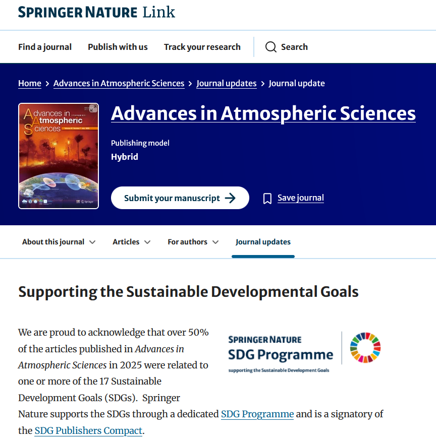 Springer Nature 通过专门的 SDG 项目推动可持续发展目标的传播,并与联合国签署《SDG 出版商契约》。作为该计划的一部分,AAS 将继续致力于将高质量大气科学研究与全球可持续发展议程紧密结合,为应对环境挑战提供科学支撑。(编辑室供稿)