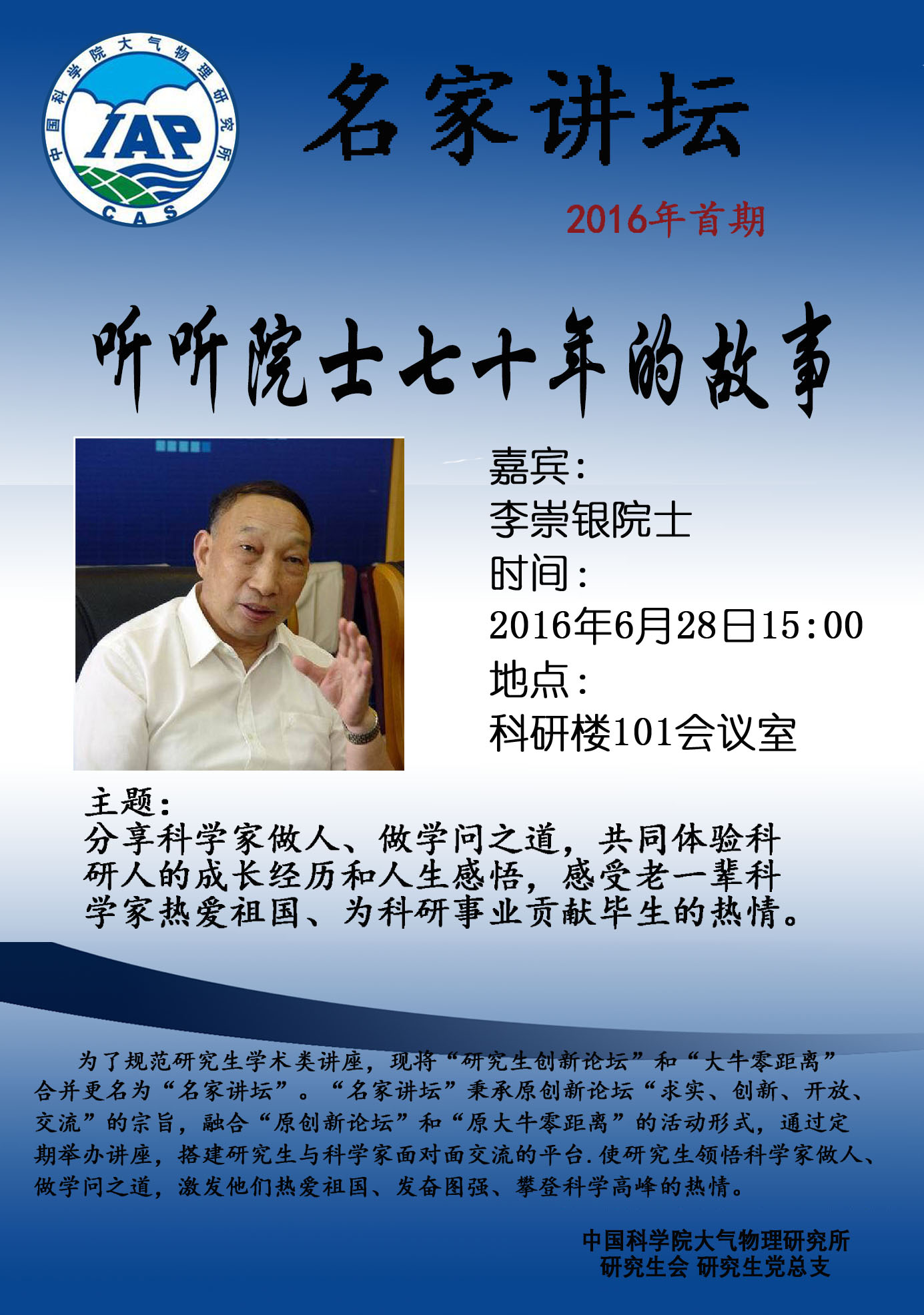为了规范研究生学术类讲座,现将“研究生创新论坛”和“大牛零距离”合并更名为“名家讲坛”。“名家讲坛”秉承原创新论坛“求实、创新、开放、交流”的宗旨,融合“原创新论坛”和“原大牛零距离”的活动形式,通过定期举办讲座,搭建研究生与科学家面对面交流的平台。名家讲坛2016年首期活动将于2016年6月28日(周二)下午3:00在大气所101会议室举行,本期邀请嘉宾是李崇银院士,届时李院士将与同学们面对面分享他七十年的人生故事。